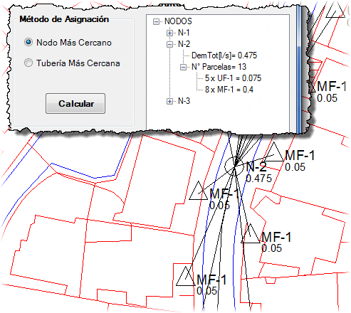 - Totalice, por cualquiera de los dos métodos disponibles: Cercanía a Nodos o Cercanía a Tuberías, la demanda de agua en los Nodos
