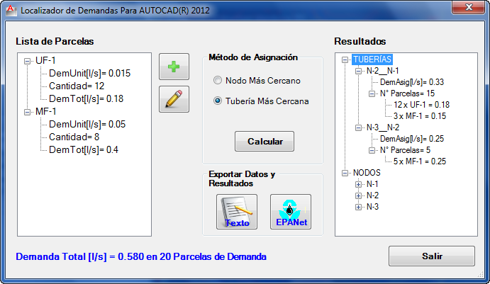 Realizada la asignación de Demandas a los nodos de la Red de Distribución, es posible luego exportar la información (de tuberías, nodos y, por supuesto, de demandas) hacia un archivo de Importación de EPANET para dedicarse simplemente a la realización del cálculo hidráulico. Sin errores y en una fracción del tiempo en que se tardaría realizándolo de forma manual.